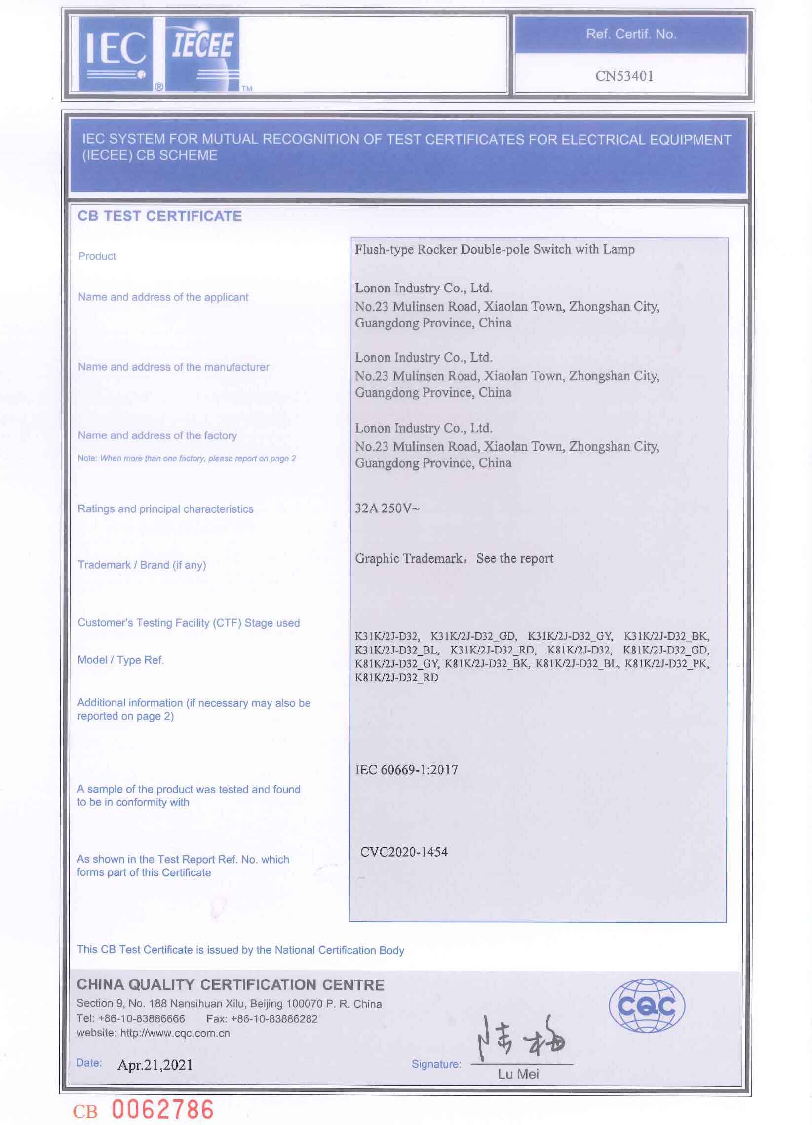 CN53401 K3K8_32A CB Test CERTIFICATE